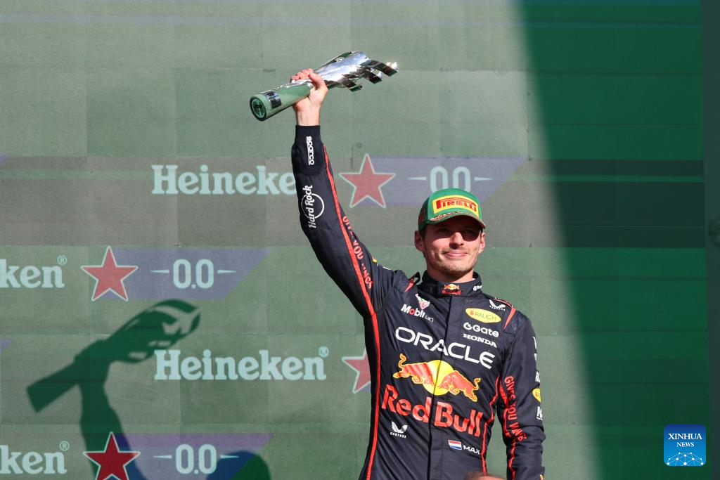 Third-placed Red Bull's Dutch driver Max Verstappen attends the awarding ceremony for the Formula One Mexico Grand Prix at the Hermanos Rodriguez Circuit in Mexico City, Mexico, Oct. 26, 2025. (Xinhua/Li Mengxin)