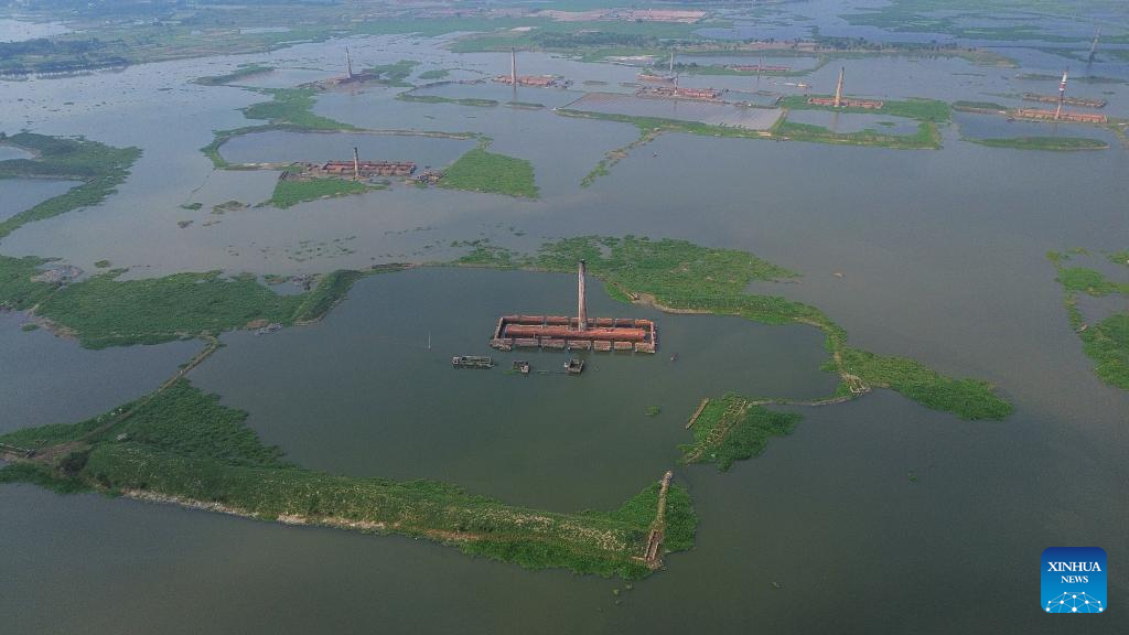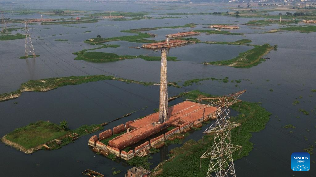 An aerial drone photo taken on Oct. 25, 2025 shows some brickyards half submerged in floodwater in Dhaka, Bangladesh. Heavy rainfall and rising river levels have submerged low-lying areas around the capital including some brickyards. (Photo by Habibur Rahman/Xinhua)