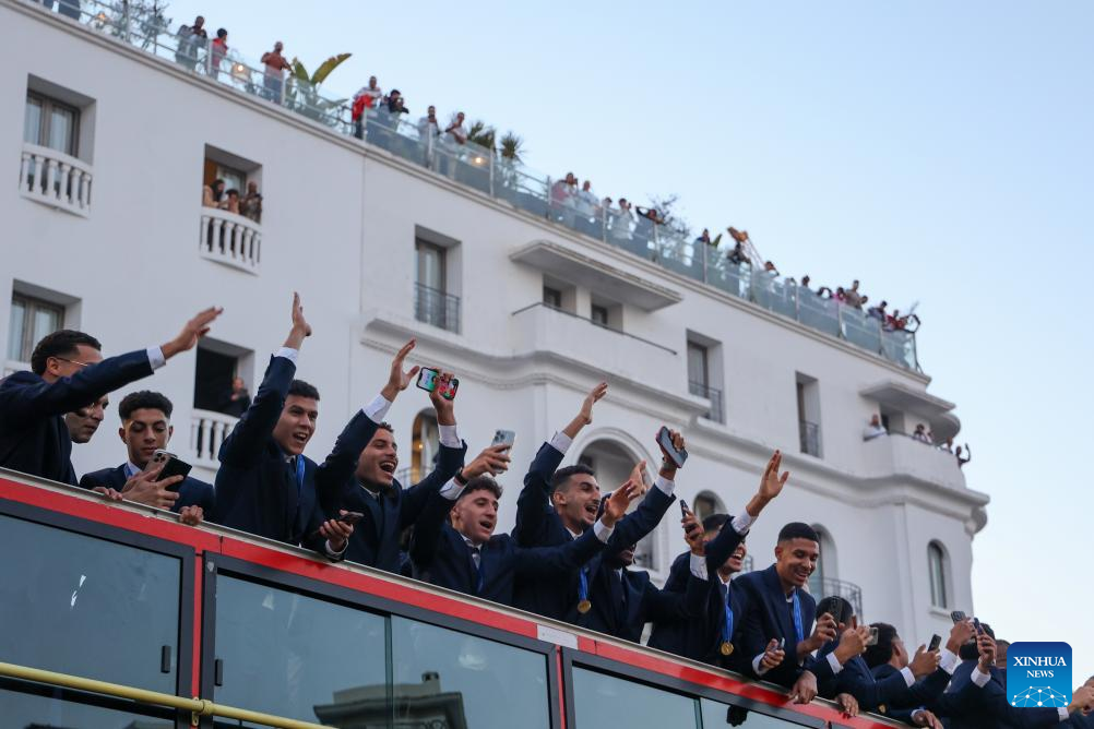 Players of Morocco U20 football team celebrate during a parade celebrating them winning the U20 World Cup in Rabat, Morocco, Oct. 22, 2025. (Xinhua/Huo Jing)