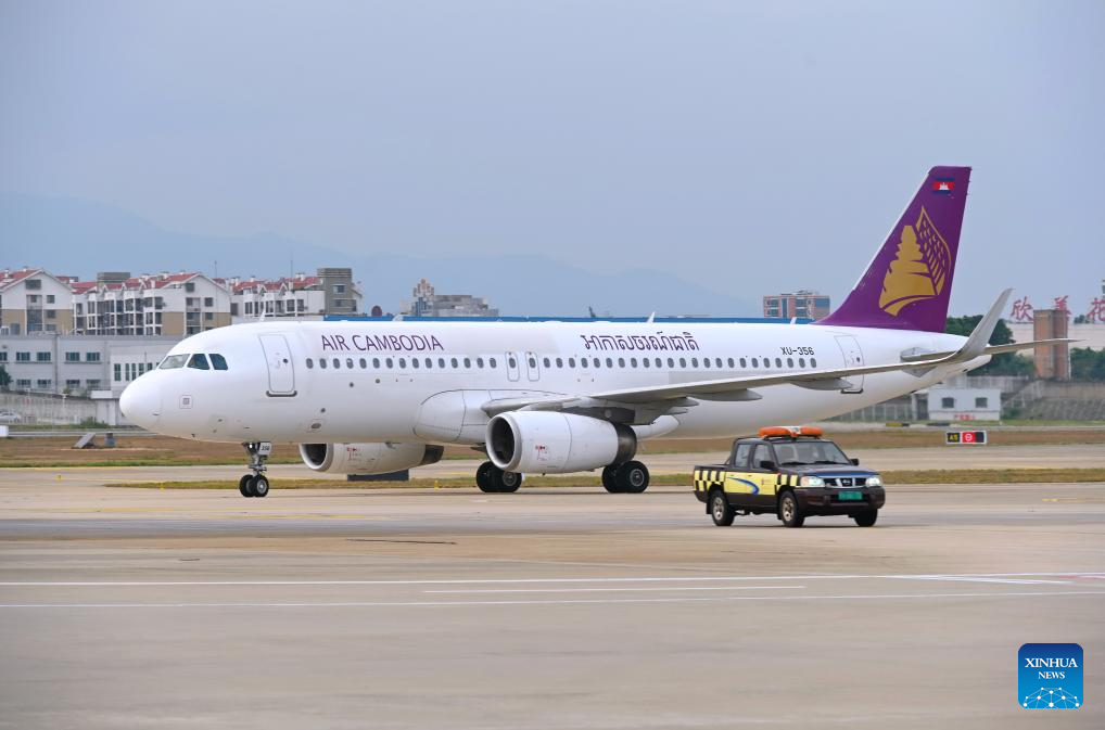 An airplane, departing from Cambodia's capital Phnom Penh, arrives at the Fuzhou Changle International Airport in Fuzhou, southeast China's Fujian Province, Oct. 26, 2025. (Xinhua/Lin Shanchuan)