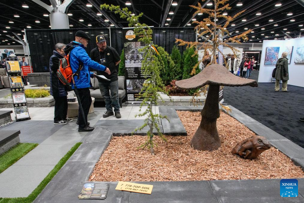 People view a garden design during the 2025 Vancouver Fall Home Show at the Vancouver Convention Centre in Vancouver, Canada, Oct. 23, 2025. The 2025 Vancouver Fall Home Show kicked off here on Thursday and will last until Sunday, showcasing home-related products and services. (Photo by Liang Sen/Xinhua)