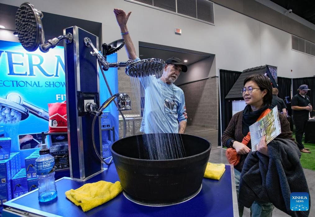 A woman learns about a shower head during the 2025 Vancouver Fall Home Show at the Vancouver Convention Centre in Vancouver, Canada, Oct. 23, 2025. The 2025 Vancouver Fall Home Show kicked off here on Thursday and will last until Sunday, showcasing home-related products and services. (Photo by Liang Sen/Xinhua)