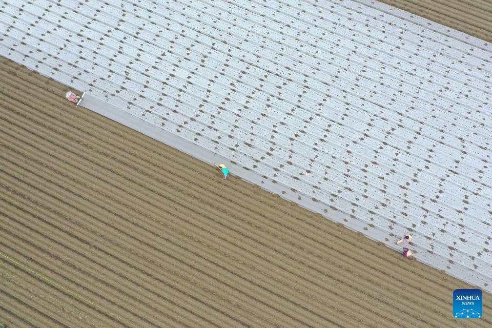 An aerial drone photo taken on Oct. 22, 2025 shows farmers working at a vegetable planting base in Shanba Village of Songjiang Town in Dongpo District of Meishan City, southwest China's Sichuan Province. (Photo by Yao Yongliang/Xinhua)