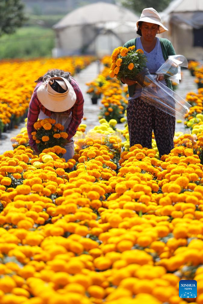 A farmer harvests marigold flowers in Mexico City, capital of Mexico, Oct. 21, 2025. Every year on Nov. 1 and 2, Mexicans celebrate the Day of the Dead. In the days leading up to the festival, fields of marigolds are harvested and brought to markets, eventually adorning streets, homes, and cemeteries across the country. (Photo by Francisco Canedo/Xinhua)