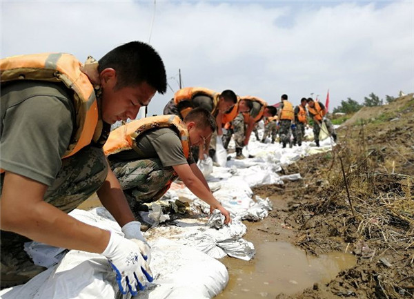 ????第71集團(tuán)軍某旅工兵連官兵在江西九江柴桑區(qū)江洲鎮(zhèn)江新洲堤上展開搶險(xiǎn)任務(wù)。新華社發(fā)(郭仁杰 攝)
