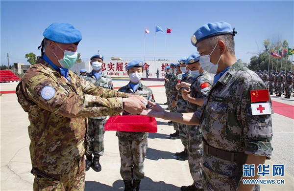 ????6月16日,中國(guó)第18批赴黎巴嫩維和部隊(duì)全體410名官兵被授予聯(lián)合國(guó)勛章,以表彰他們?cè)谌蝿?wù)期內(nèi)為維護(hù)黎巴嫩南部地區(qū)和平與穩(wěn)定做出的突出貢獻(xiàn)。新華社發(fā)(彭希 攝)