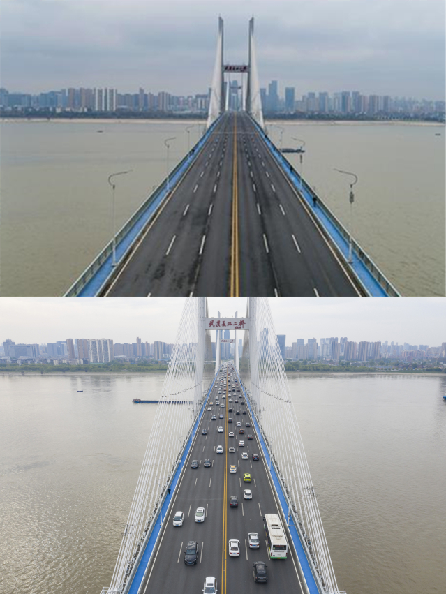 ▲上圖為2020年1月27日的武漢長江二橋。來源:中國日報(bào);下圖為2020年4月14日的武漢長江二橋。新華社記者 才揚(yáng) 攝