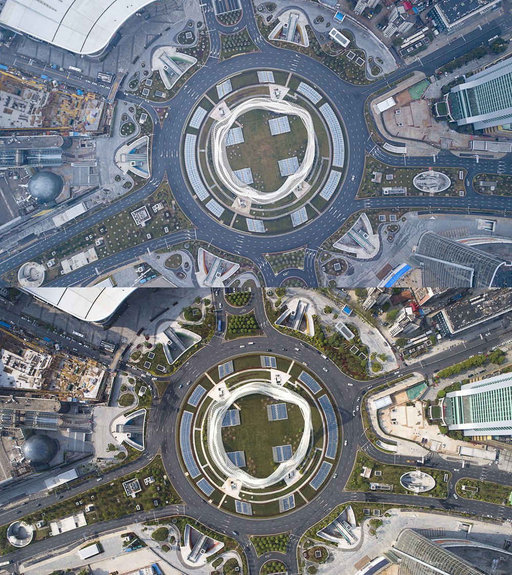 ▲上圖為1月26日的武漢光谷廣場綜合體;下圖為4月8日的武漢光谷廣場綜合體。新華社記者 熊琦 攝