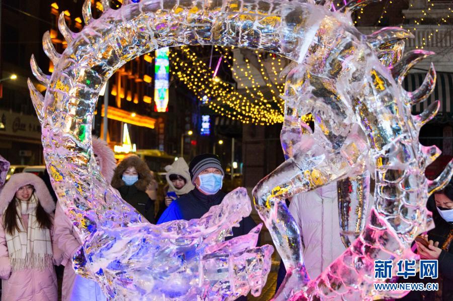 2021年1月1日,游客在哈爾濱中央大街觀賞冰雕。