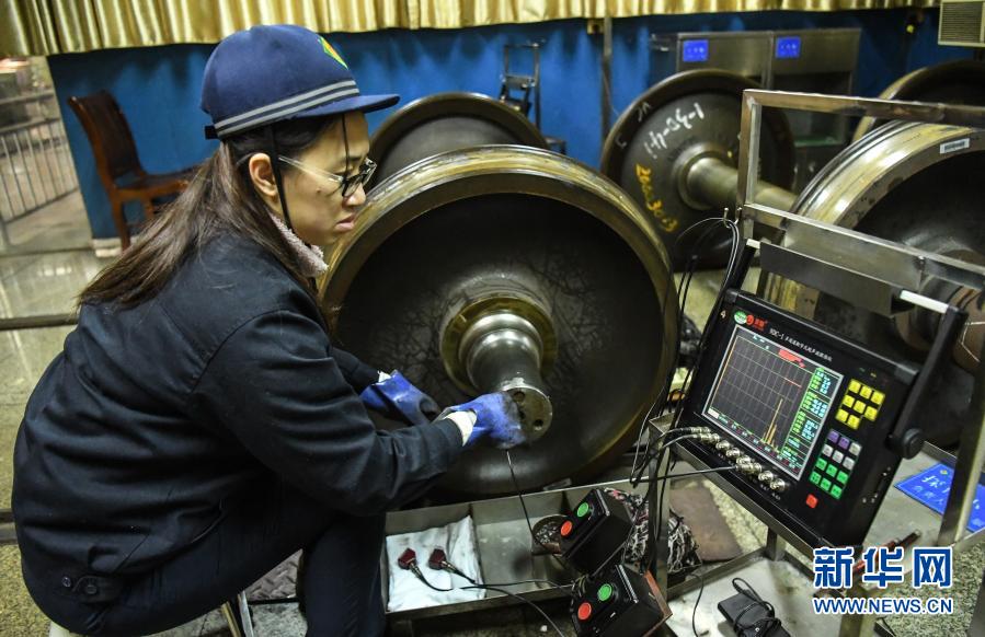 2月1日,柳州車輛段車輪車間無損檢測員黃婷對輪對進(jìn)行探傷檢查。新華社記者 張愛林 攝