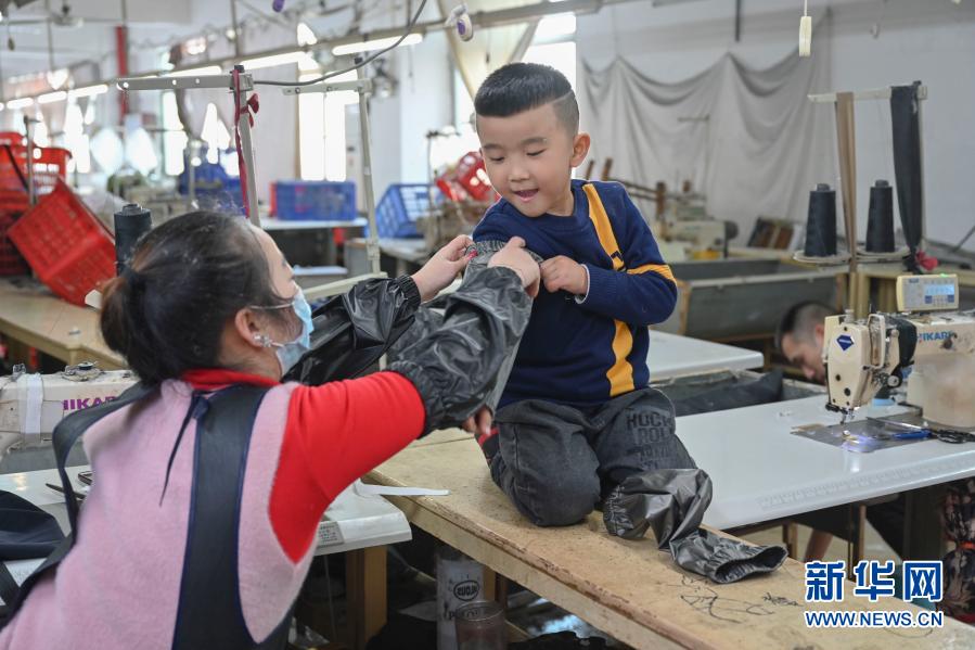 1月26日,在福建省石獅市的金利萊斯服裝廠,聰聰戴上媽媽用工廠邊角剩余面料為老家的奶奶縫制的袖套。