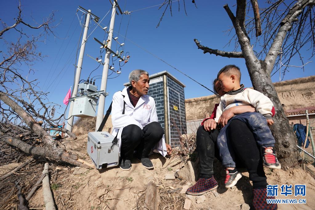 在山西省石樓縣鐵頭村巴福山自然村,張尚保(左)詢問(wèn)村民的身體情況(3月23日攝)。新華社記者 詹彥 攝