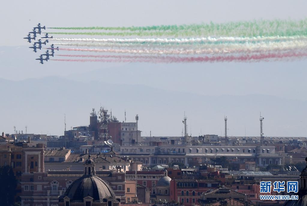 3月30日,意大利“三色箭”飛行表演隊從羅馬上空飛過,留下代表意大利國旗顏色的三色彩煙。