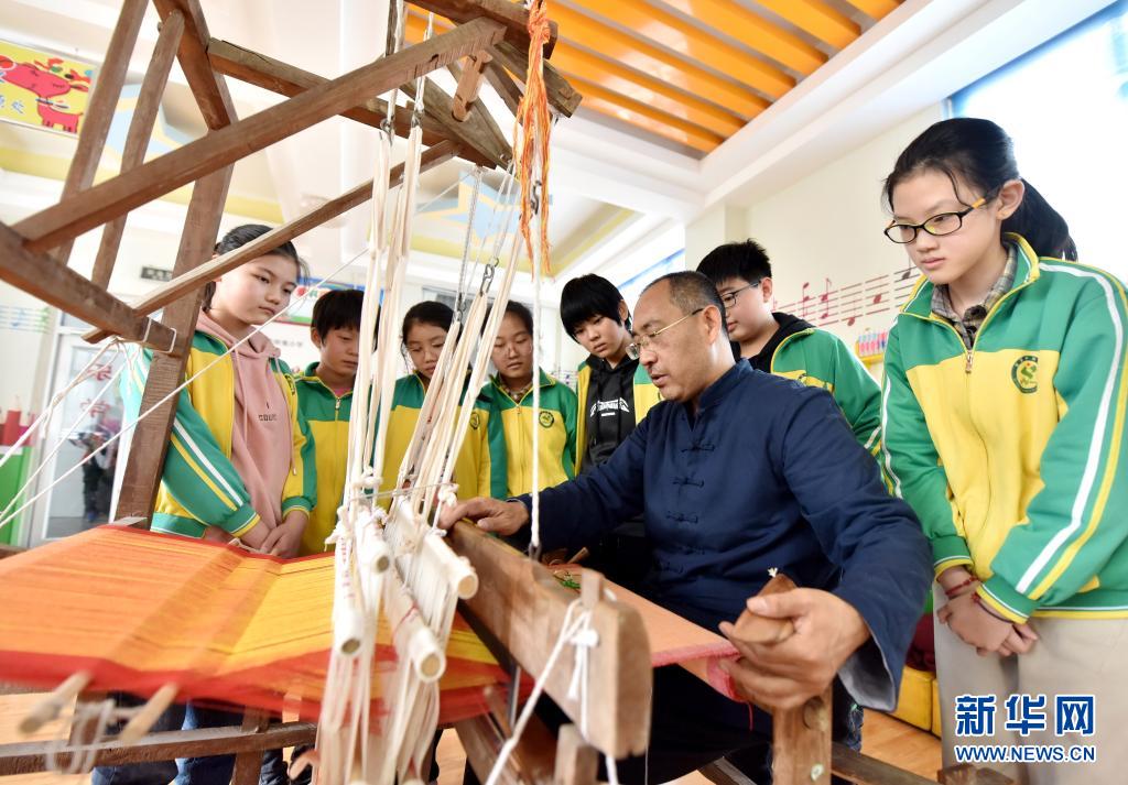 4月7日,威縣土布紡織技藝傳承人高慶海在威縣第四小學(xué)向?qū)W生演示老粗布紡織技藝。近年來(lái),河北省邢臺(tái)市威縣積極開(kāi)展“非遺傳承進(jìn)校園”活動(dòng),將當(dāng)?shù)靥厣沁z項(xiàng)目引入學(xué)校課堂,讓學(xué)生近距離感受民間傳統(tǒng)技藝的魅力,促進(jìn)非遺文化的保護(hù)和傳承。新華社記者 朱旭東 攝