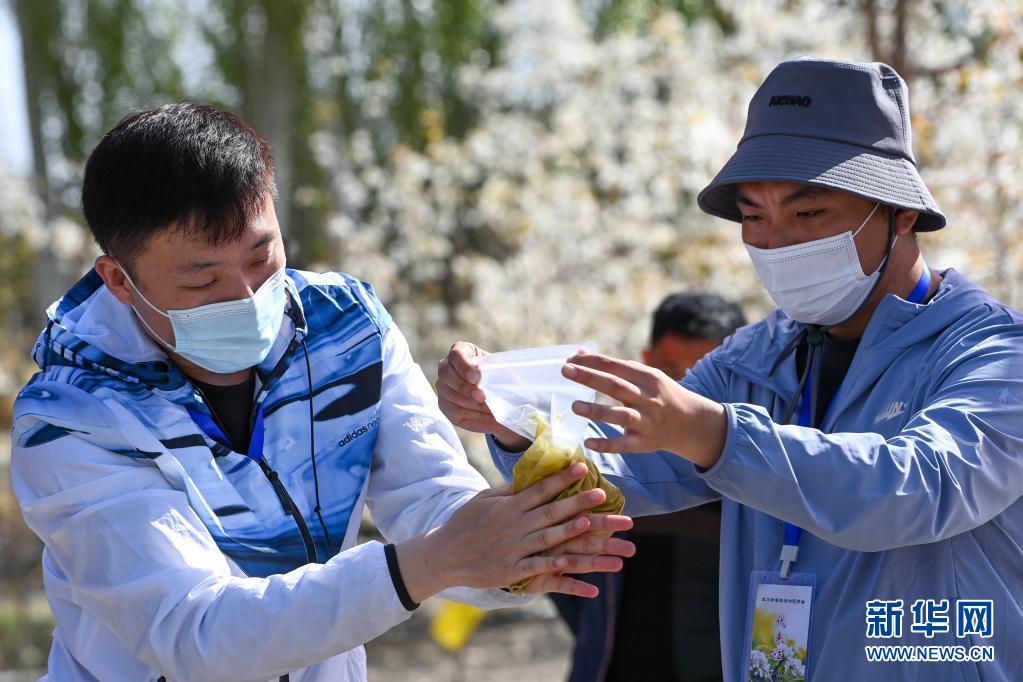 4月11日,在鐵門關市一處香梨示范園,技術(shù)人員將花粉溶解。