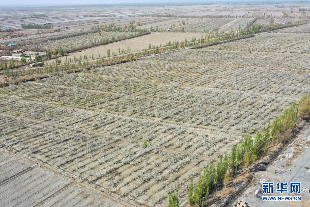 這是4月11日在鐵門關市拍攝的一處梨園(無人機照片)。新華社記者 丁磊 攝