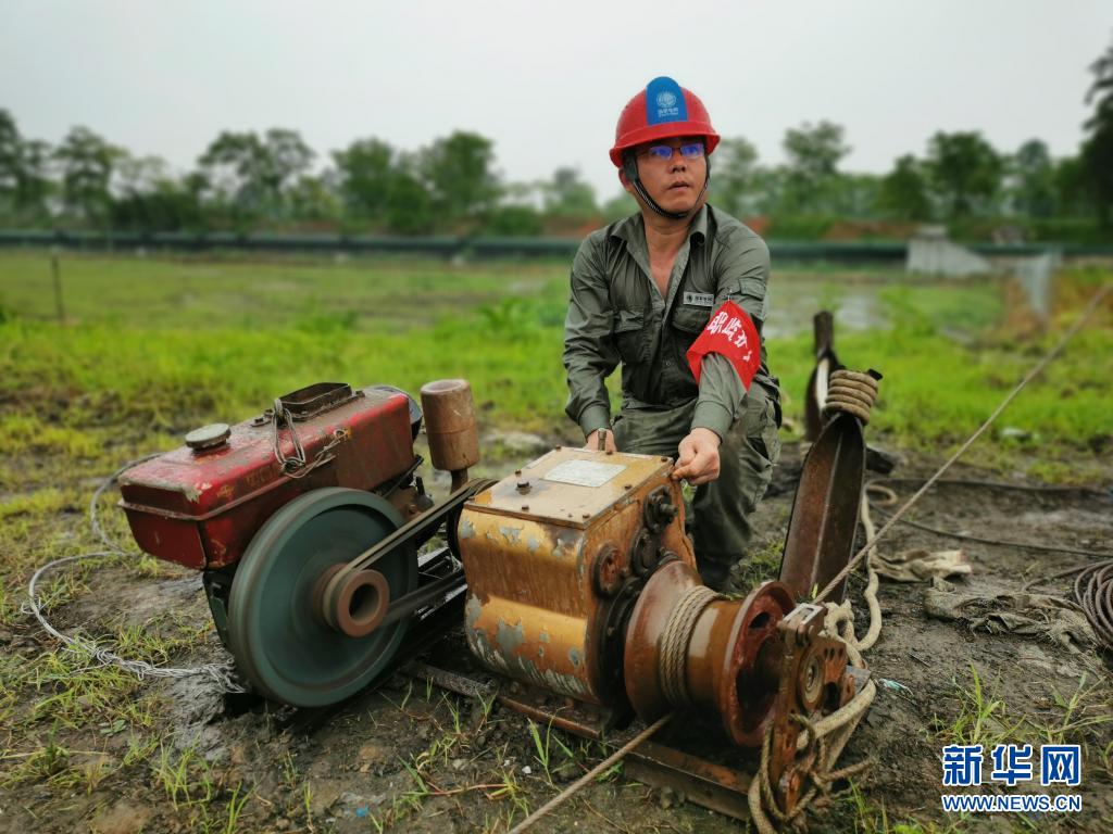 “跑山電工”黨員服務隊隊員操作機動絞磨牽引導線(5月3日攝)。