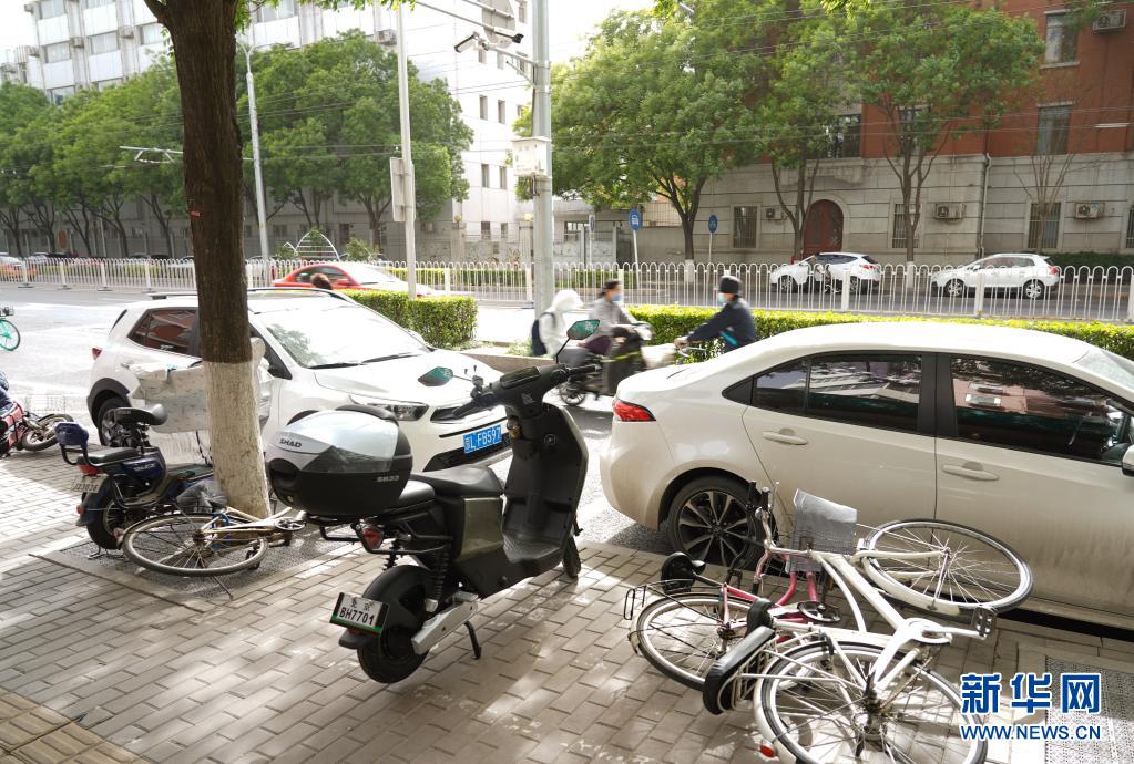 5月6日,在北京市西城區長椿街,路邊停放的自行車被大風吹倒。