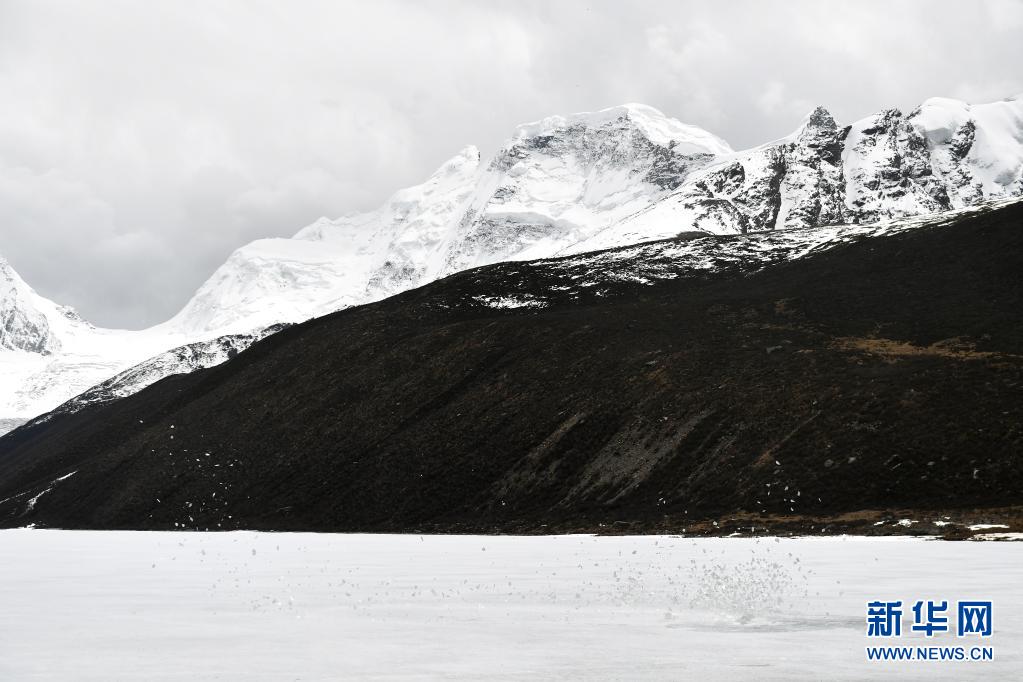 一陣強風掠過薩普雪山腳下的冰湖時卷起湖面的薄冰(5月4日攝)。