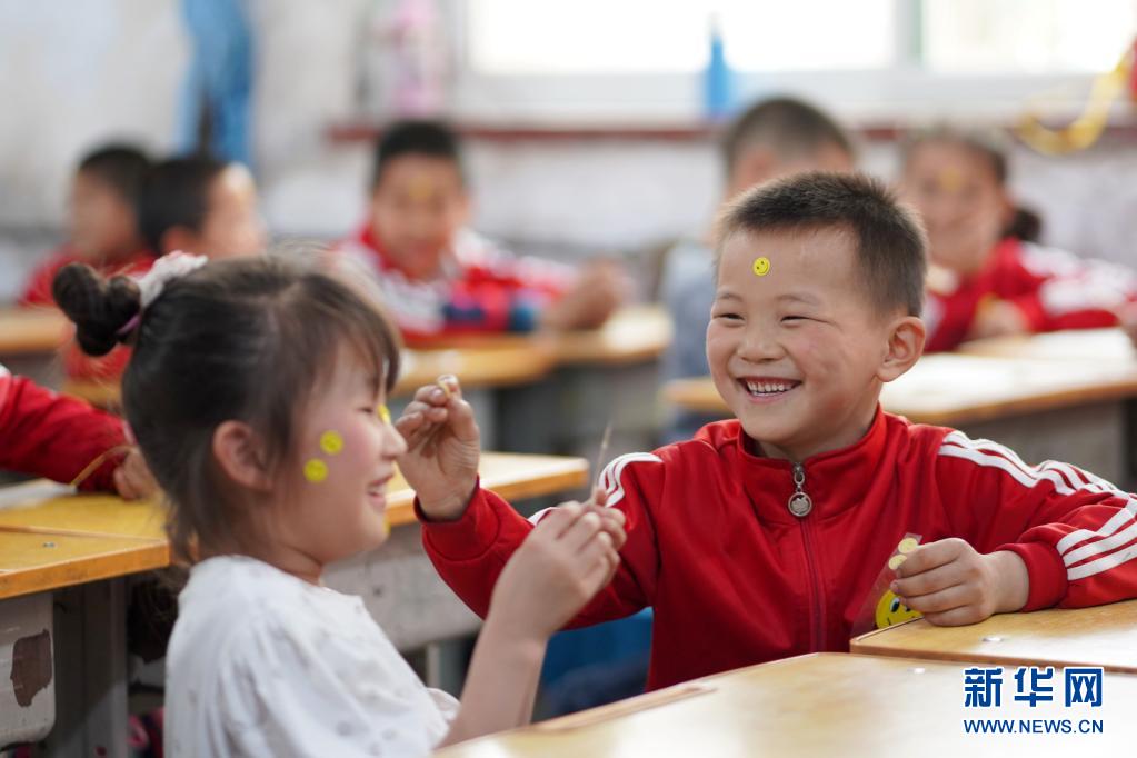 5月7日,河北省邢臺市內丘縣南賽中心小學的學生在教室做貼笑臉游戲。世界精神衛生組織將每年的5月8日定為“世界微笑日”,希望通過微笑促進人類身心健康,增進社會和諧。新華社發(劉繼東 攝)