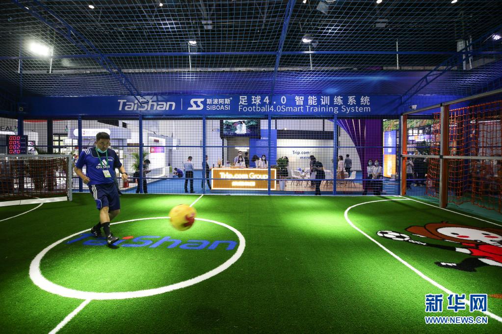 5月7日,參展商在消博會現場演示足球智能訓練系統。