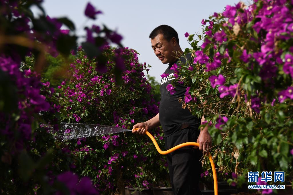 5月7日,在秦北世紀花園中心,一名園藝工人在為三角梅澆水。