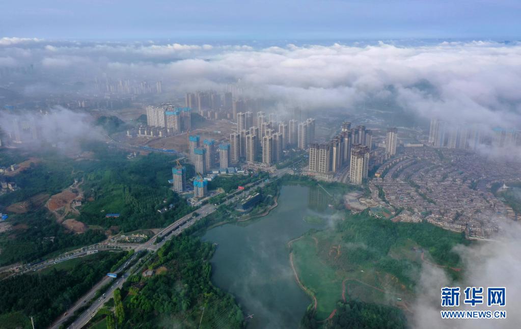 5月8日,貴陽市觀山湖區的高樓被霧氣籠罩(無人機照片)。