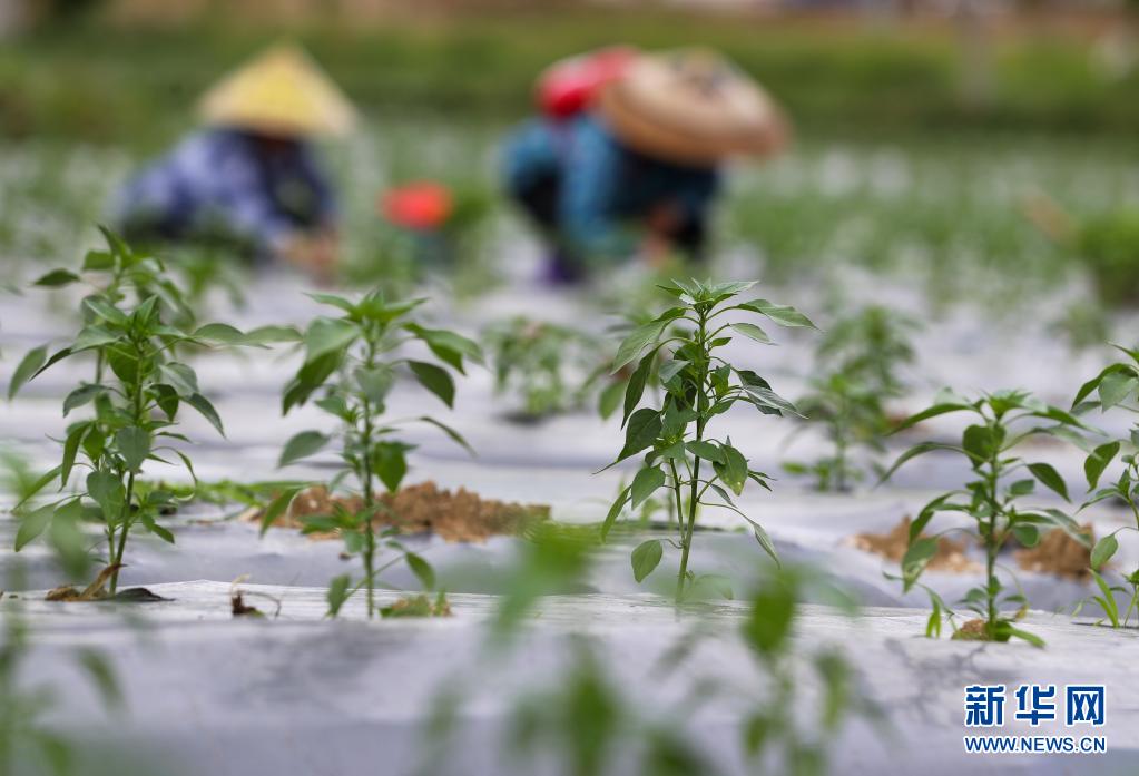 5月13日,村民在玉屏侗族自治縣田坪鎮(zhèn)慶寨村辣椒種植基地管護辣椒苗。