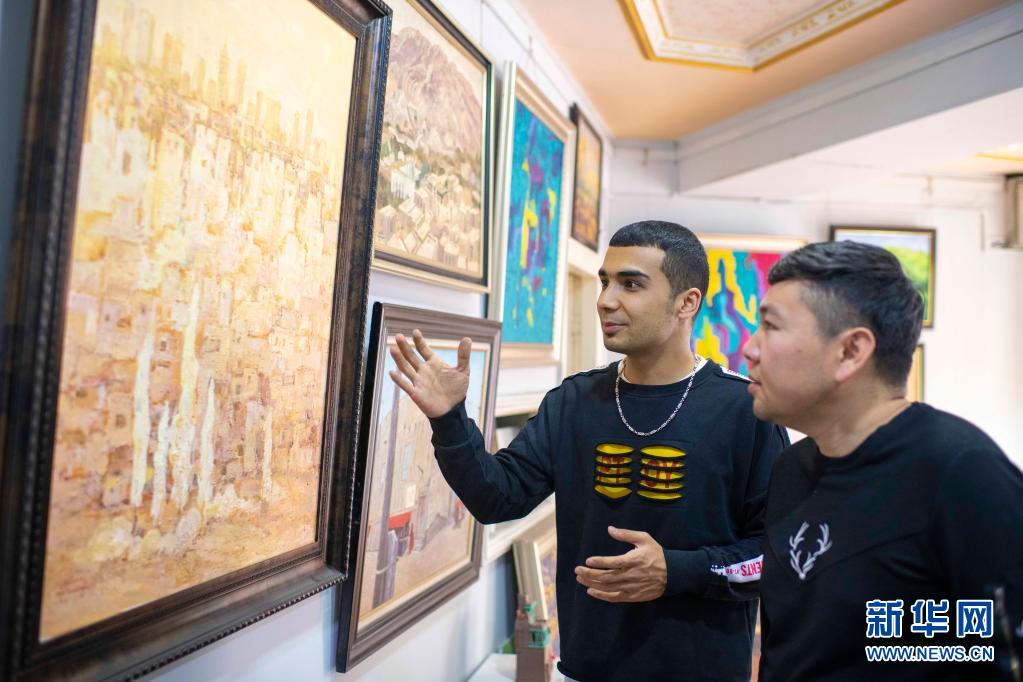 麥麥提吐爾遜江·麥麥提依明(左)在工作室內向朋友介紹他創作的關于喀什的畫作《走進新時代》(5月5日攝)。新華社記者 胡虎虎 攝