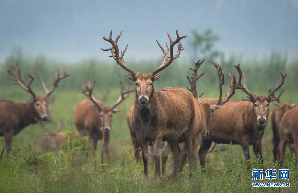 5月17日,一群麋鹿在石首麋鹿國家級自然保護區內活動。