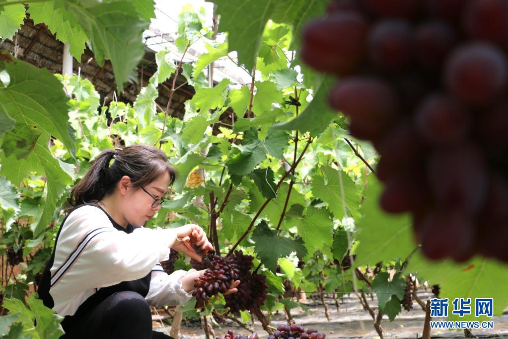 5月23日,市民在河北省平泉市道虎溝鄉雙峰社區一處設施葡萄大棚里采摘茉莉香葡萄。
