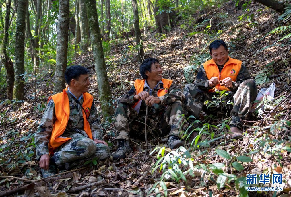 護林員楊有山(左)和同事巡護期間在林中休息(3月15日攝)。