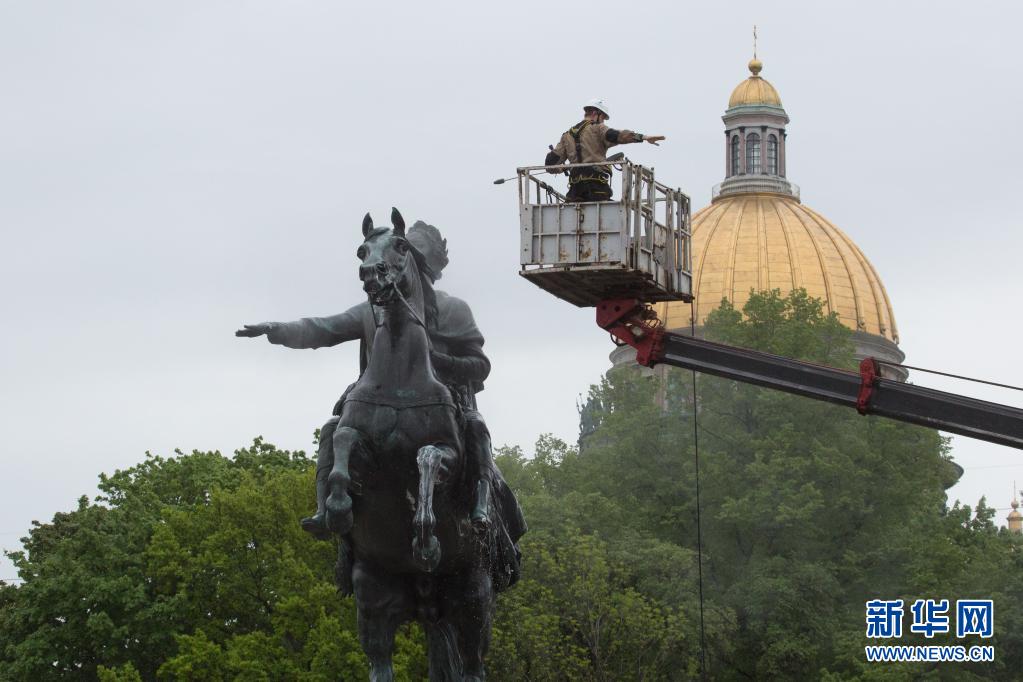 5月26日,工作人員在俄羅斯圣彼得堡清潔“青銅騎士”雕像。