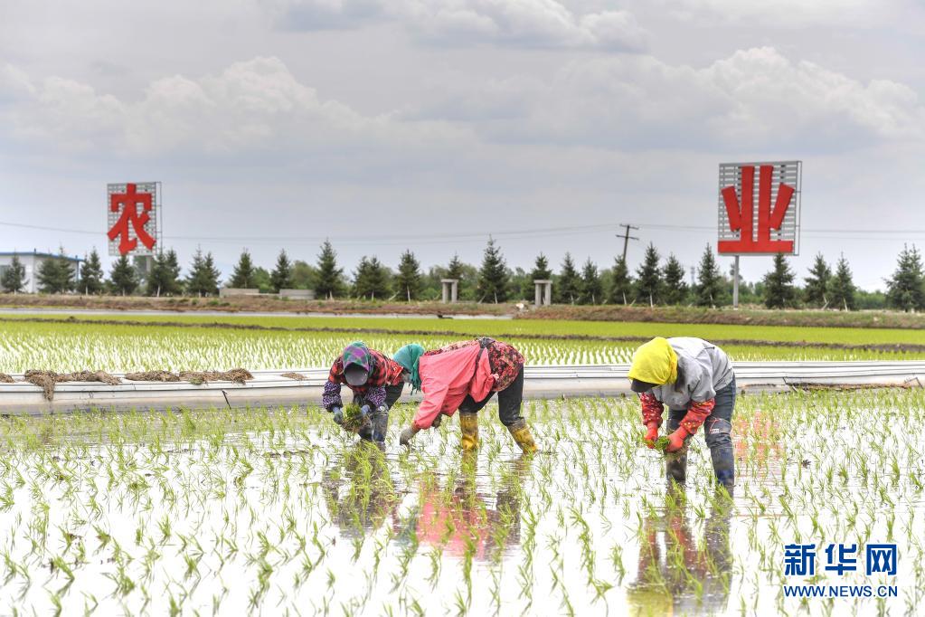 5月26日,在吉林省吉林市永吉縣萬昌鎮宇豐米業2萬畝高標準水田基地,農民進行水稻補苗工作。