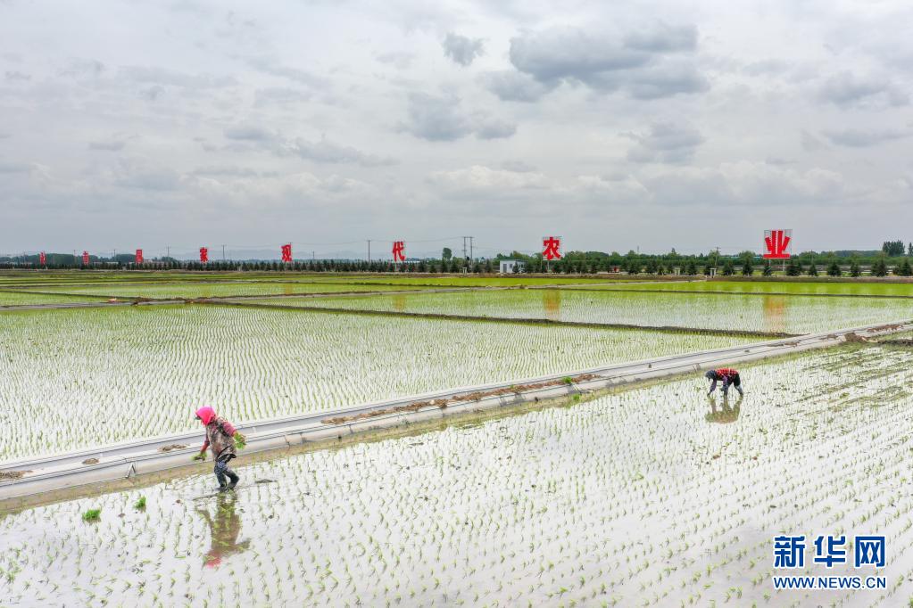 5月26日,在吉林省吉林市永吉縣萬昌鎮宇豐米業2萬畝高標準水田基地,農民進行水稻補苗工作(無人機照片)。