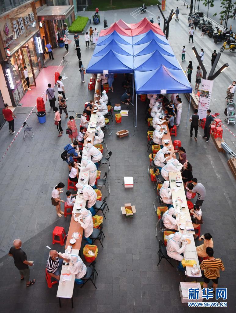 5月27日,在廣州荔灣區(qū)廣鋼新城核酸臨時采集點,南方醫(yī)科大學南方醫(yī)院的醫(yī)務人員進行核酸檢測采樣。新華社記者 鄧華 攝