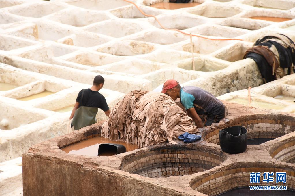 5月30日,工人正在摩洛哥非斯古城內(nèi)的皮革染坊中勞作。