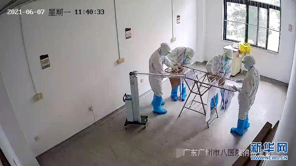 6月7日,廣州市八醫院嘉禾院區監控畫面顯示,醫護人員對隔離病房考生的試卷、答題卡進行二次消毒。新華社發