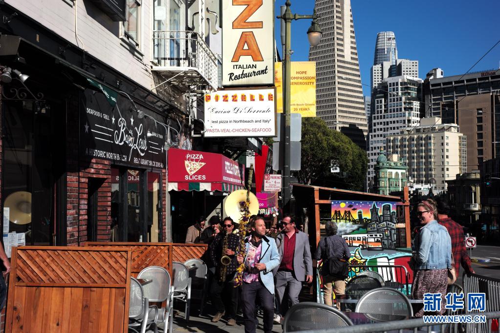 6月15日,一支樂隊在美國加利福尼亞州舊金山街頭演奏。