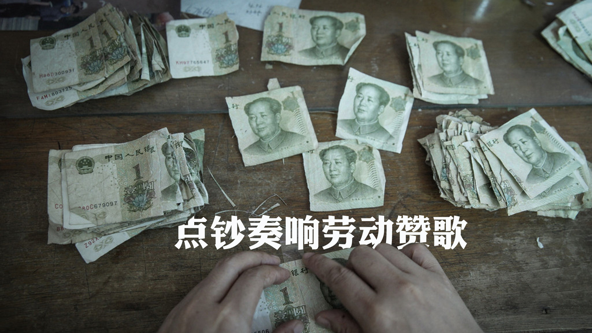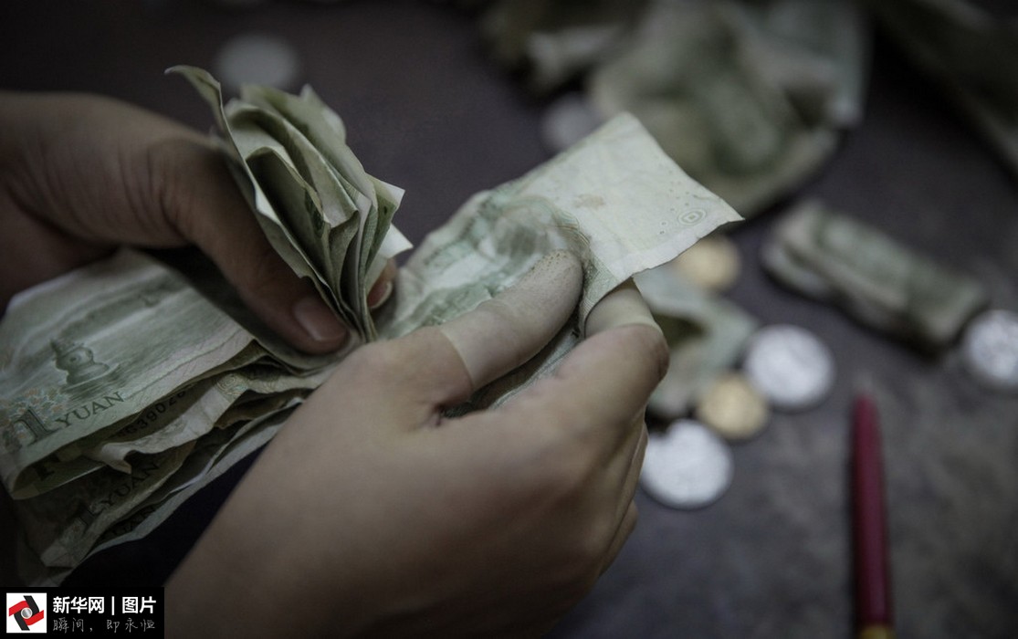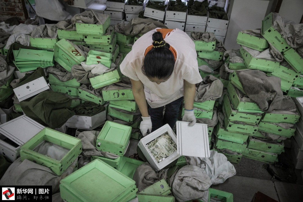 點鈔中心的員工在修補殘破的人民幣。