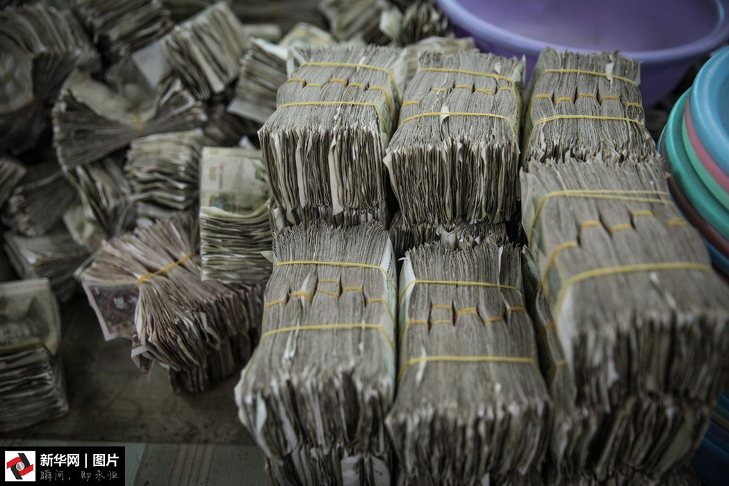 點鈔員從成堆的投幣箱內(nèi)清理出零鈔準(zhǔn)備清點。
