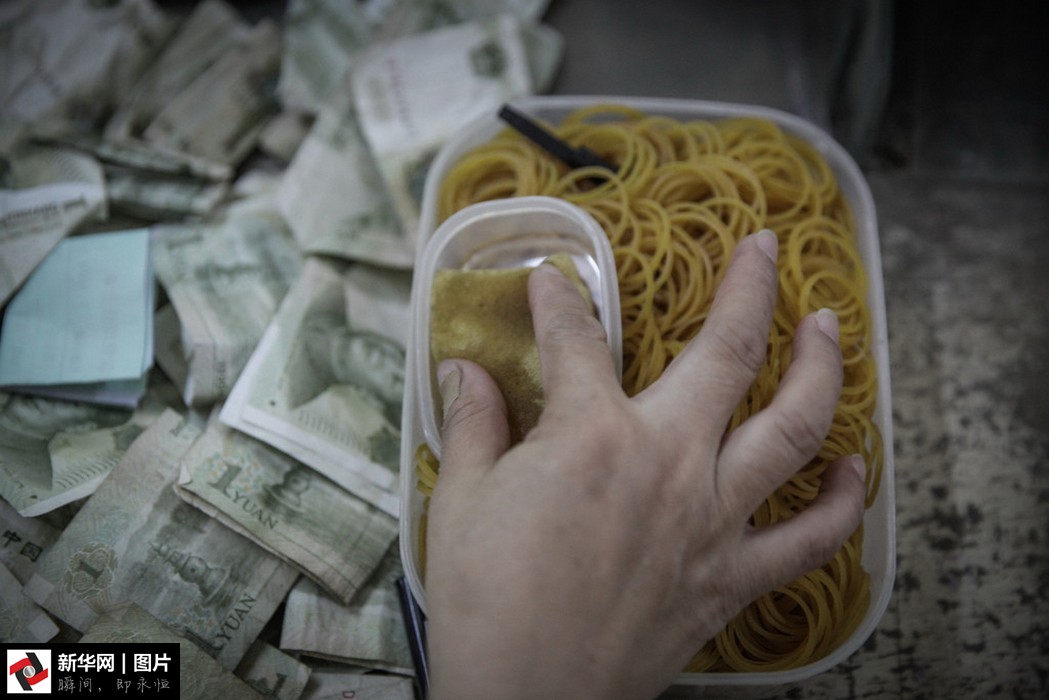 點鈔員肖冬常年累月的坐著重復(fù)數(shù)錢的動作,讓她的腰椎和頸椎常常感到不適,“轉(zhuǎn)眼間,已經(jīng)當(dāng)了20多年的點鈔員,這些年數(shù)過多少錢肯定沒有準(zhǔn)確數(shù)據(jù)了,從一天數(shù)幾百張到如今的一萬多張,是時間教會人成長。”圖為點鈔員沾濕手指準(zhǔn)備點鈔。