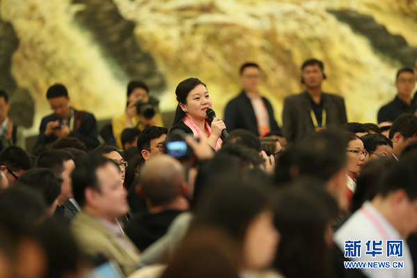 2017年10月17日下午,中國共產黨第十九次全國代表大會新聞發言人在人民大會堂三樓金色大廳舉行新聞發布會,并回答中外記者提問。圖為新華社記者提問。新華網 翟子赫 攝