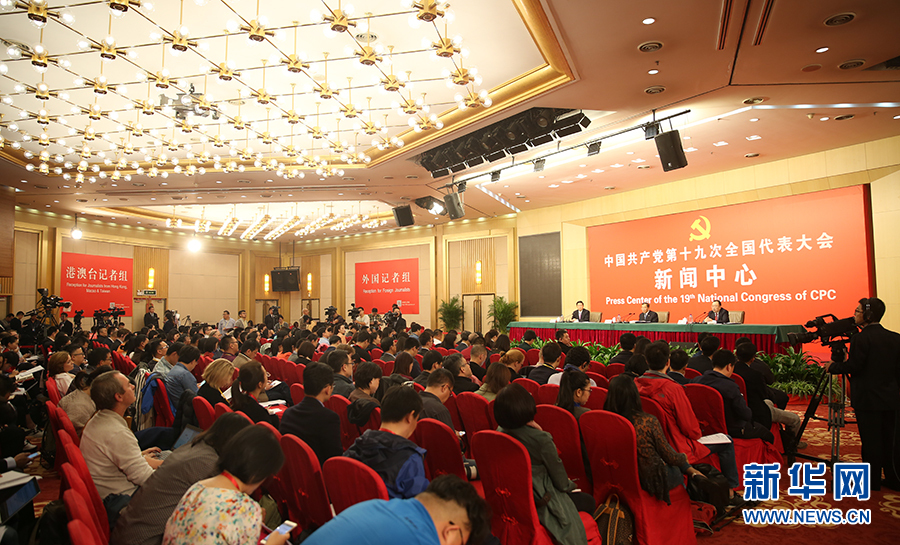 ??? 10月19日,十九大新聞中心舉行記者會,邀請中紀委、中組部負責人介紹黨的建設和全面從嚴治黨相關情況。圖為記者會現場。新華網 郝廣鵬攝