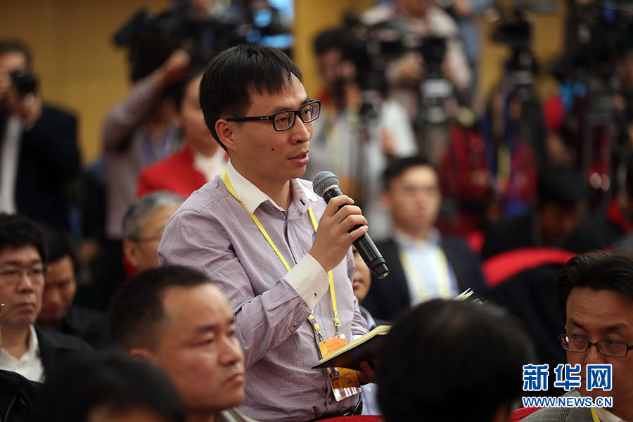 10月21日,十九大新聞中心舉辦記者招待會,邀請國家發(fā)展改革委黨組書記、主任何立峰,副主任張勇,副主任寧吉喆介紹以新發(fā)展理念為引領(lǐng),推進(jìn)中國經(jīng)濟(jì)平穩(wěn)健康可持續(xù)發(fā)展有關(guān)情況,并回答記者提問。圖為經(jīng)濟(jì)日報記者提問。新華網(wǎng) 郝廣鵬攝