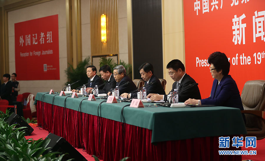 10月22日,十九大新聞中心舉辦記者招待會,邀請教育部黨組書記、部長陳寶生,民政部黨組書記、部長黃樹賢,人力資源社會保障部黨組書記、部長尹蔚民,住房城鄉(xiāng)建設(shè)部黨組書記、部長王蒙徽,國家衛(wèi)生計(jì)生委黨組書記、主任李斌介紹滿足人民新期待,保障改善民生有關(guān)情況,并回答記者提問。圖為記者招待會現(xiàn)場。新華網(wǎng) 郝廣鵬攝