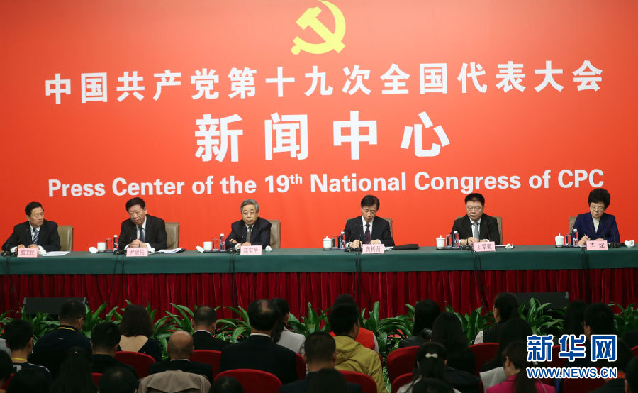 10月22日,十九大新聞中心舉辦記者招待會(huì),邀請(qǐng)教育部黨組書(shū)記、部長(zhǎng)陳寶生,民政部黨組書(shū)記、部長(zhǎng)黃樹(shù)賢,人力資源社會(huì)保障部黨組書(shū)記、部長(zhǎng)尹蔚民,住房城鄉(xiāng)建設(shè)部黨組書(shū)記、部長(zhǎng)王蒙徽,國(guó)家衛(wèi)生計(jì)生委黨組書(shū)記、主任李斌介紹滿(mǎn)足人民新期待,保障改善民生有關(guān)情況,并回答記者提問(wèn)。圖為記者招待會(huì)現(xiàn)場(chǎng)。新華網(wǎng) 郝廣鵬攝