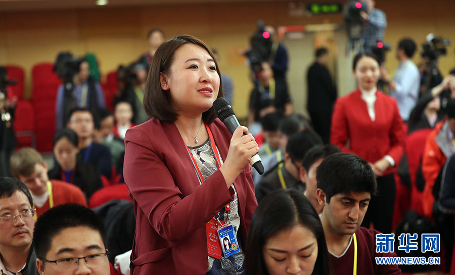 10月22日,十九大新聞中心在梅地亞中心二層新聞發布廳舉辦集體采訪活動,主題為“中國特色強軍之路邁出堅定步伐”。圖為中國國際廣播電臺記者提問。新華網 郝廣鵬攝