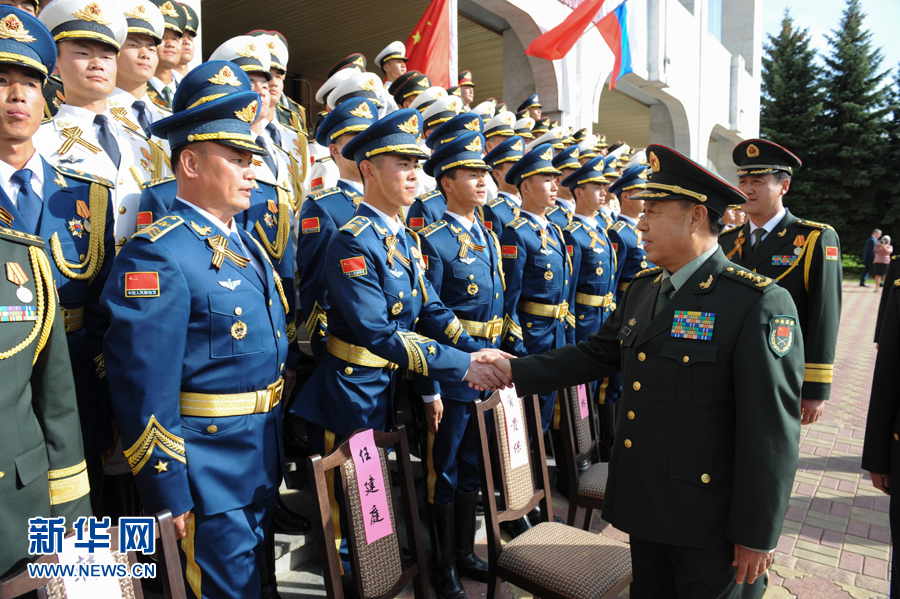 ??? 5月9日,在俄羅斯首都莫斯科,中共中央政治局委員、中央軍委副主席范長龍看望中國人民解放軍三軍儀仗隊官兵。受習近平主席委托,中共中央政治局委員、中央軍委副主席范長龍9日下午來到參加俄羅斯紀念衛國戰爭勝利70周年慶典的我軍閱兵方隊駐地看望官兵,代表習主席和中央軍委向方隊官兵圓滿完成參閱任務表示祝賀,勉勵他們認真總結經驗,牢記強軍目標,獻身強軍實踐,為黨和人民再立新功。新華社記者戴天放攝??