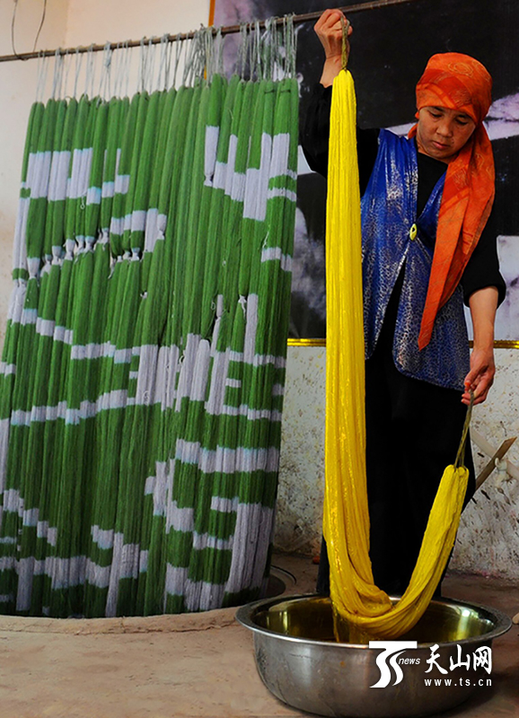 而今,這種技法漸漸被注入新鮮血液。6月底,當記者走進吉亞鄉喀了塔吐格曼村家庭作坊,在院子里看見正在染色的艾比比班 卡斯木。一蘸、一染、一擰、一轉,一套動作下來就能浸染一小段艾德萊斯了,有了現成的絲線和染料后,這項神秘扎染技藝顯得更加快捷了,村民們也樂于接受這種高效的生產模式。